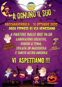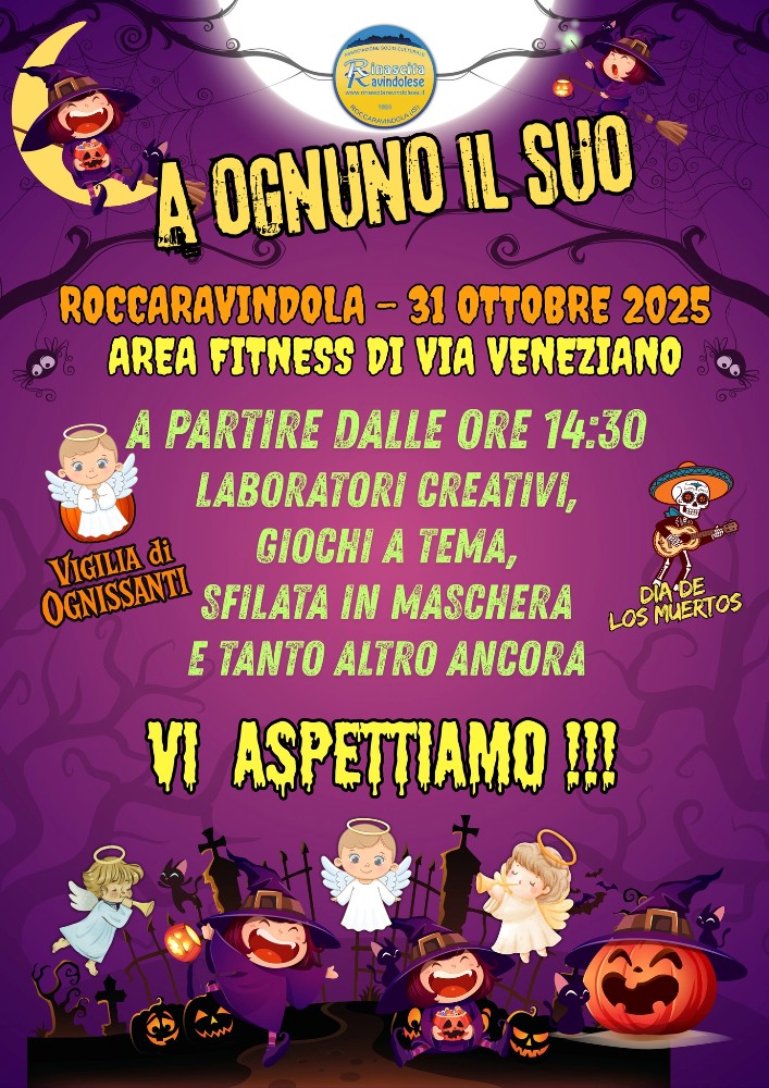 VENERDI' 31 OTTOBRE 2025 L'ASSOCIAZIONE RINASCITA RAVINDOLESE HA ORGANIZZATO, PRESSO IL CAMPO POLIVALENTE "DON VINCENZO D'AGOSTINO" E NELL'ADIACENTE NUOVA AREA FITNESS, UNA GIORNATA DEDICATA ALLE VARIE INTERPRETAZIONI DELLE FESTIVITA' DI OGNISSANTI CHE SI FESTEGGIANO NEL MONDO, TRA CUI QUELLA MESSICANA "DIA DE LOS MUERTOS"