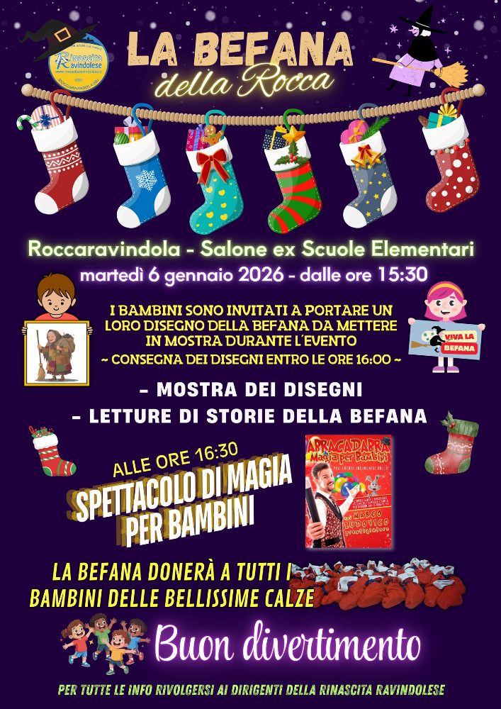 IL 6 GENNAIO 2026 L'ASSOCIAZIONE RINASCITA RAVINDOLESE HA ORGANIZZATO PRESSO L'EX SCUOLA ELEMENTARE DI ROCCARAVINDOLA L'ARRIVO DELLA BEFANA CHE HA PORTATO CALZE DI DONI A TUTTI I BAMBINI PRESENTI.